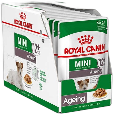 Royal Canin Mini Ageing 85 g (12’li paket) yaş mama, küçük ırk yaşlı köpeklerin özel beslenme ihtiyaçları dikkate alınarak formüle edilmiştir. Yumuşak dokusu ve yüksek lezzetliliği sayesinde yaşlı köpekler için kolay tüketim sağlar.