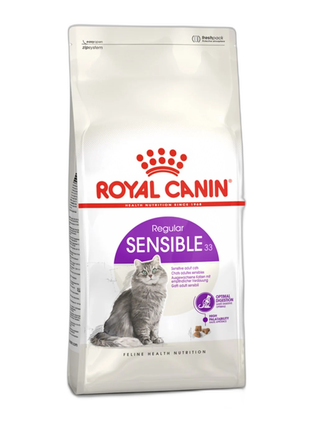 Royal Canin Sensible 33, hassas sindirime sahip yetişkin kedilerin beslenme ihtiyaçları dikkate alınarak özel olarak formüle edilmiştir. Yüksek sindirilebilirliğe sahip protein kaynakları sayesinde sindirim sisteminin rahat çalışmasına ve besin emiliminin artırılmasına yardımcı olur.